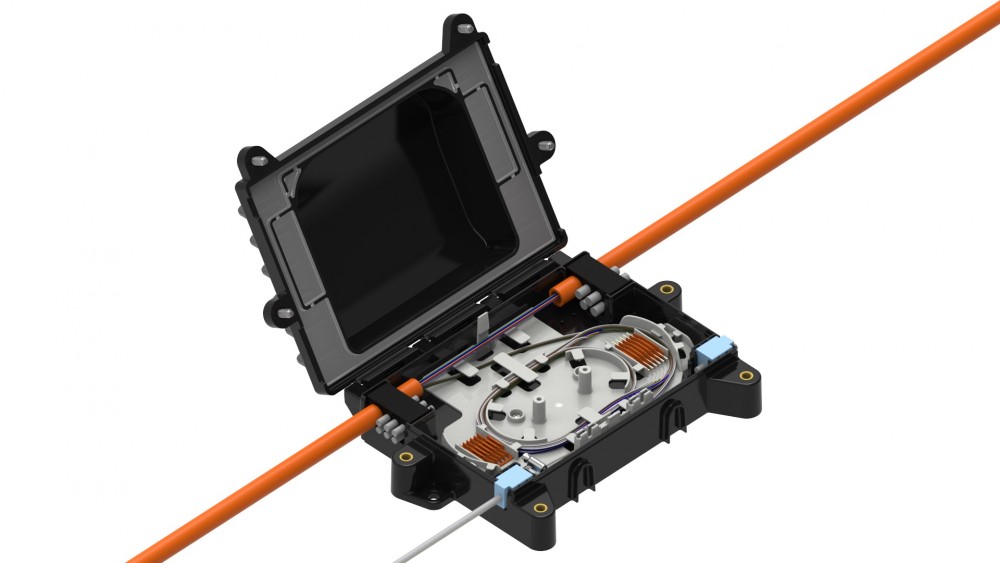 Ettersom den er IP68-klassifisert, kan den benyttes utendørs – enten direkte i jord, eller i luft (ADSS). Fiberboksen finnes med et komplett utvalg av tilbehør. Den leveres med bunnseksjon med 4 porter, innfesting for strekkavlaster, lokk til skjøtebrett SC + SE, og slangeklemmer.