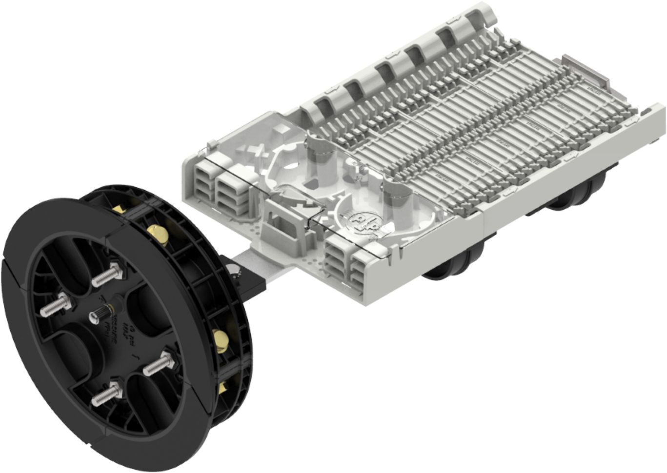 Skjøteboksen har fire hjørneporter, som gir installatøren fleksibilitet til å konfigurere lukkingen etter behov. Den har 4 stk. porter, og leveres med skjøtebrett for 24 fiber.