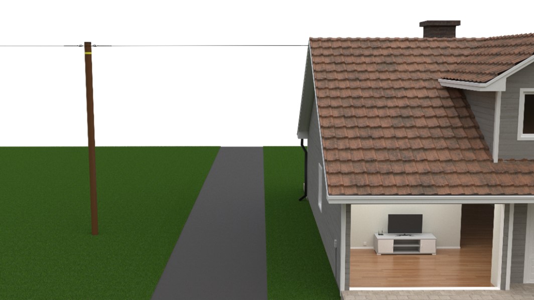 3D-tegning som illustrerer kabelen fra stolpe til stue, direkte på vegg.