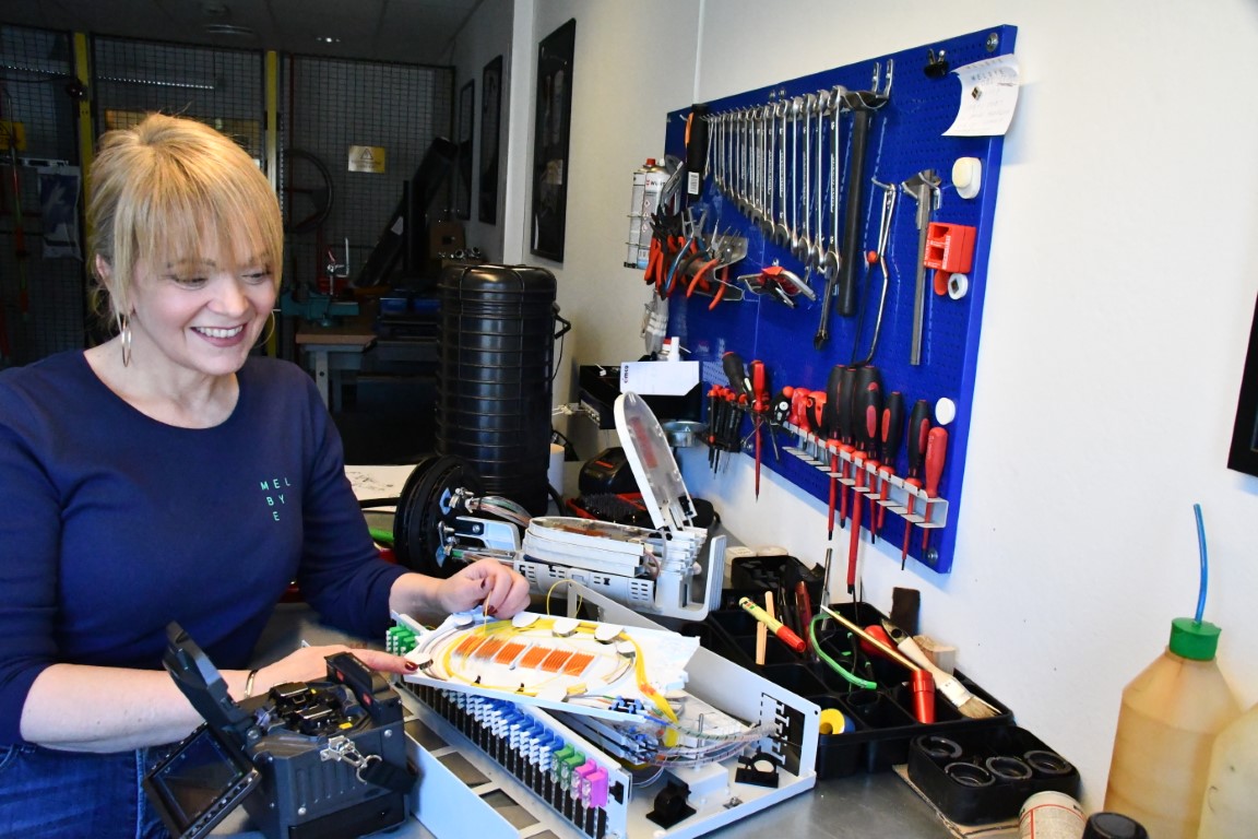 Hun er stadig å se omringet av fiberkabler, skjøtemaskiner og verktøy.