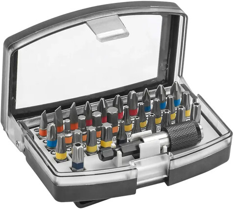 32‑delt bitssett i praktisk oppbevaringsboks, inkl. belteklips og opphengsfunksjon. Magnetisk hurtigskifteholder (C6.3), lengde 60 mm. Profesjonelle bits med fargering.