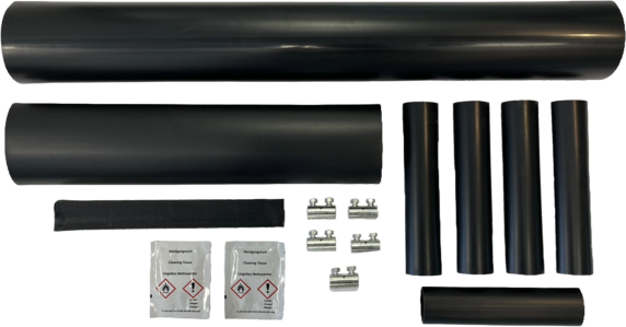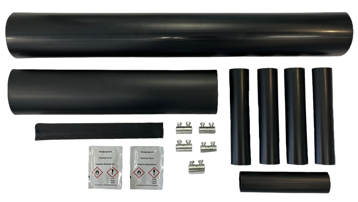 E-verksskjøt komplett som inneholder faseslanger, mellomslange, ytterslange, mastik, renseserviett, pussepapir, montasjeveiledning og 5 stk skruskjøtehylser Al/Cu.