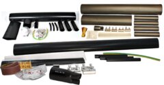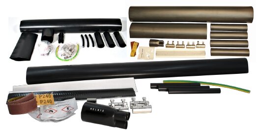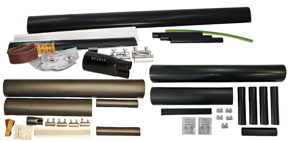 Kabelskjøt komplett som inneholder faseslanger, mellomslange, ytterslange, mastik, renseserviett, pussepapir, kabelskritt, montasjeveiledning og 4 stk skruskjøtehylser Al/Cu.