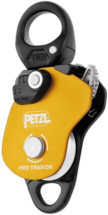 Petzl Pro Traxion er en liten men kraftig sperreblokk som tåler tunge løft. Den har en integrert svivel, stort trinsehjul med beskyttet kulelager og mekanisme som gjør at man kan låse den i "åpen" stilling slik at den fungerer også som en vanlig kasteblokk.