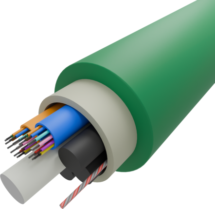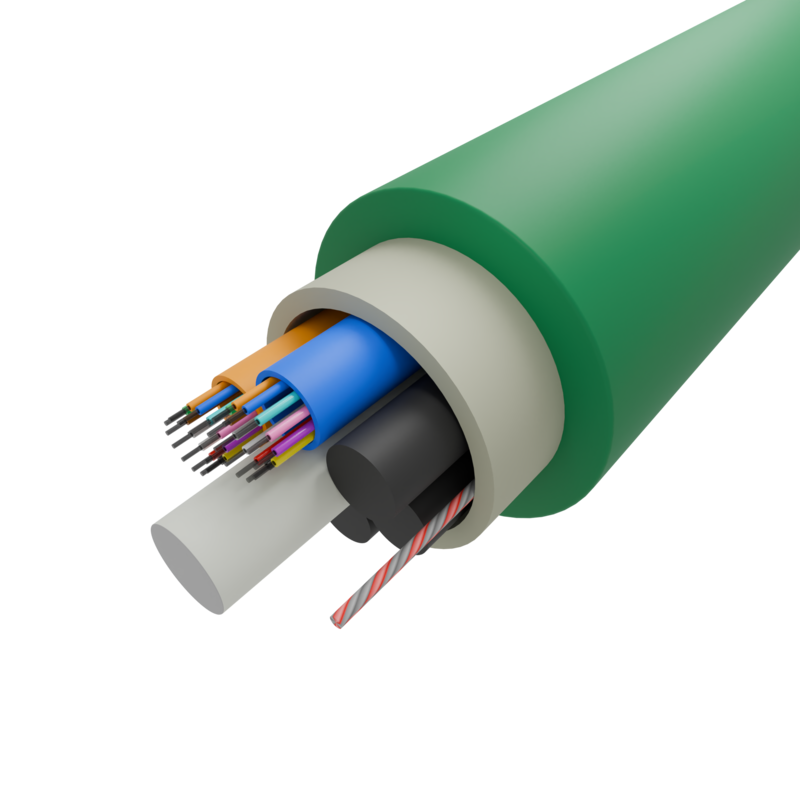 Fiberoptisk kabel for innendørs- og utendørsbruk. Kabelen inneholder 24-144F med løs kledning. Fibrene ligger beskyttet i tuber. Grønn halogenfri og brannhemmende LSZH kappe. Langsgående vanntett, UVbestandig og metallfri.