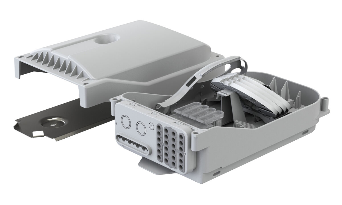 Den unike bunnplaten muliggjør innføring av opptil 24 abonnentrør/kabler kun ved å trykke de på plass i sporene. Kabel/rør blir automatisk strekkavlastet og tettet/forseglet i innføringen.