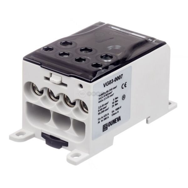 Kan skrues til underlaget eller festes på DIN skinne.MDB 400 C, 1-polet distribusjons blokk for inngående 1xAl/Cu 95-240mm² /utgående 4x Cu 2,5-35 mm² og 3x Cu 6-50 mm2. OJL distribusjons blokker er laget for å brukes når man ønsker å distribuere strøm til flere mindre ledninger.Un = 1000V In = 380A Al / 425 Cu. 2,5-35mm2 =6Nm,6-50 mm2 = 10 Nm og 95-240 =25Nm.