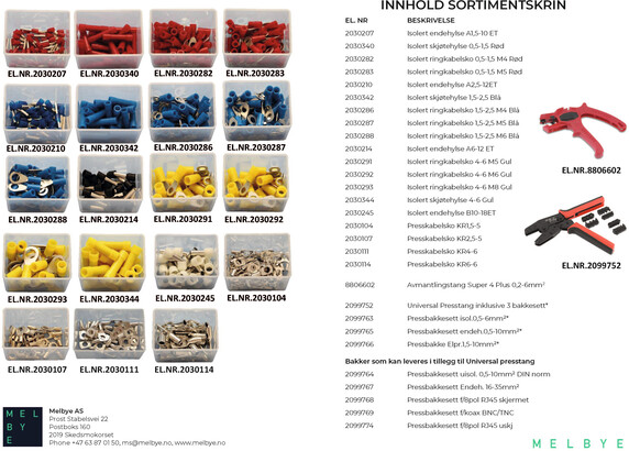 Leveres sammen med presstang "Click `n` crimp" og avmantlingstang "Super 4 plus" i et Raaco sortimentskrin med tilpasset skumplass for tengene og 5 ekstra bakker, samt hylser og sko fordelt i 19 sortimentbokser.