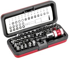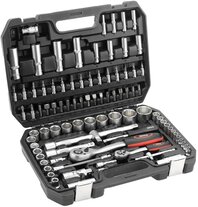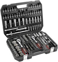 Skrallesett 171 deler, laget av krom‑vanadiumstål, i solid plastboks 171‑delt pipenøkkelsett i krom‑vanadiumstål, levert i en robust plastboks. Drivstørrelser: 6,3 mm (1/4"), 10 mm (3/8") og 12,5 mm (1/2"). Sekskantpiper for maksimal dreiemomentoverføring. Med 6,3 mm (1/4") firkant: Sekskantpiper: 4 / 4,5 / 5 / 5,5 / 6 / 7 / 8 / 9 / 10 / 11 / 12 / 13 / 14 mm Ekstra lange piper: 4 / 5 / 6 / 7 / 8 / 9 / 10 mm Forlengere: 50 og 100 mm E‑profil: E4 / E5 / E6 / E7 / E8 Torx: T8 / T9 / T10 / T15 / T20 / T25 / T27 / T30 Torx med hull: T8 / T9 / T10 / T15 / T20 / T25 / T27 / T30 Pozidriv: PZ0 / PZ1 / PZ2 Sekskantbits: 3 / 4 / 5 / 6 mm Sporbits: 4 / 5,5 / 6,5 / 7 mm Phillips: PH0 / PH1 / PH2 Kardangledd Håndtak 150 mm Skralle 145 mm, 72 tenner T‑håndtak med skyvehode 1/4", 110 mm Adapter for 6,3 mm bits Med 10 mm (3/8") firkant: Sekskantpiper: 10 / 11 / 12 / 13 / 14 / 15 / 16 / 17 / 18 / 19 mm Ekstra lange piper: 10 / 11 / 12 / 13 / 14 / 15 mm E‑profil: E10 / E11 / E12 / E14 / E16 / E18 Forlenger: 125 mm Skralle 205 mm, 72 tenner Tennpluggpipe: 18 mm Kardangledd Adapter for 8 mm bits Med 12,5 mm (1/2") firkant: Sekskantpiper: 10 / 11 / 12 / 13 / 14 / 15 / 16 / 17 / 18 / 19 / 20 / 21 / 22 / 24 / 27 / 30 / 32 mm Ekstra lange piper: 16 / 17 / 18 / 19 / 22 mm E‑profil: E20 – E24 Tennpluggpiper: 16 og 21 mm Forlenger: 125 mm Skralle 250 mm, 72 tenner T‑håndtak med skyvehode 1/2", 250 mm Universalledd Adapter for 8 mm bits Bits 8 mm x 30 mm: Torx: T40 / T45 / T50 / T55 / T60 / T70 Torx med hull: T40 / T45 / T50 / T55 / T60 / T70 Sekskantbits: 7 / 8 / 10 / 12 / 14 mm Phillips: PH3 / PH4 Spor: 8 / 10 / 12 mm Pozidriv: PZ3 / PZ4 Bits 6,3 mm (1/4") x 25 mm: Multitann (M‑profil): M5 / M6 / M8 Torx: T5 / T6 / T7 Torx med hull: T7 RB‑profil: M5 / M6 / M7 / M8 / M9 Femstjerne (TS): TS10 / TS15 / TS20 / TS25 / TS27 / TS30 / TS40 / TS45 Unbrakonøkler: 1,27 / 1,5 / 2 / 2,5 / 3 / 4 / 5 mm